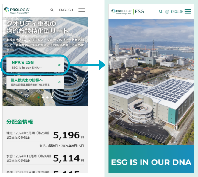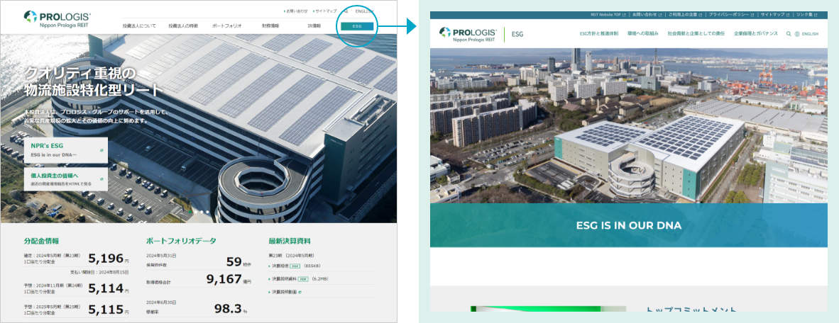 ESGへの取組みとしては、J-REITトップクラスを誇る97.8%のグリーンビルディング認証取得比率の維持・向上の他、保有施設の屋根を利用した太陽光発電、施設内へのLED照明の導入や、GHG(温室効果ガス)排出量の削減のための各施設のグリーン電力化の推進を積極的に行っております。また、足元ではポートフォリオの11.4%の区画でグリーン電力を調達しており、今後もこの取組みを継続していく予定です。