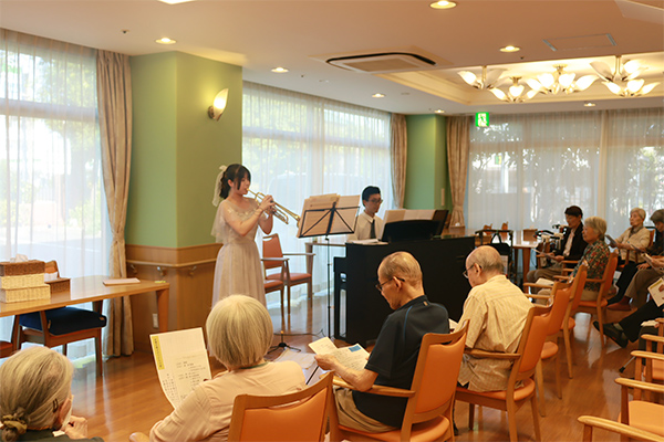 一つは、「遊音奏(ゆうおんそう)」。プロのミュージシャンによるピアノやサックス、バイオリンなどの生演奏を間近で体感しながら、カスタネットやマラカスなどの楽器を手に、一緒に演奏や合唱に参加していただく音楽プログラムです。懐かしの歌謡曲を中心に構成しており、初開催となった2025年6月には、「次回は『マツケンサンバ』を!」といったリクエストが寄せられるほどご好評をいただきました。今後は、お客様と一緒に音を合わせる発表会の実現を目指しています。