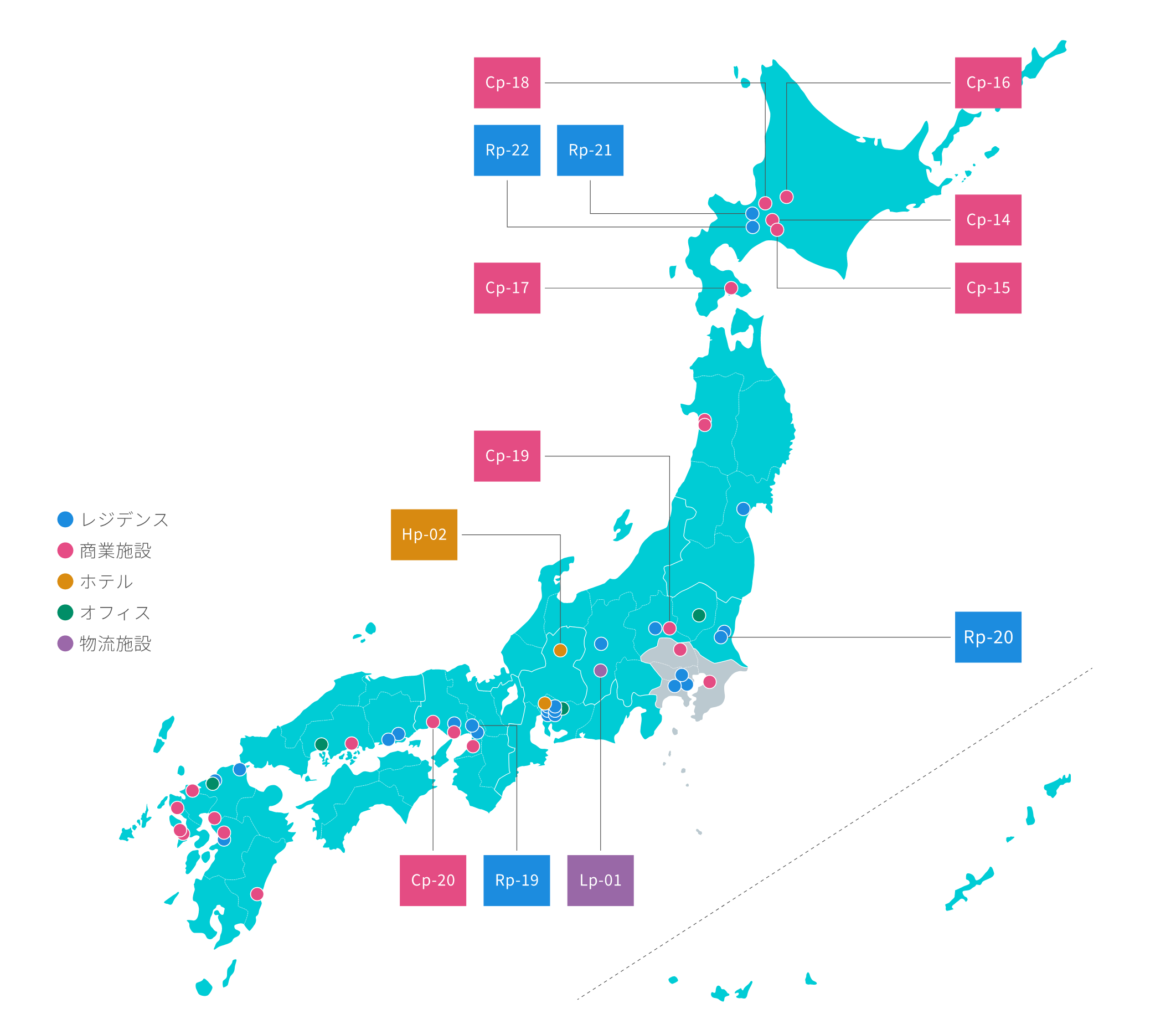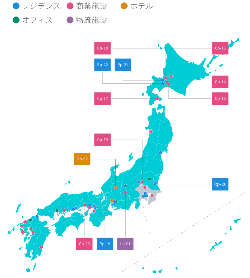 - (注)日本地図上の「物件番号」は、本投資法人の保有資産について、「投資対象」及び「地域別投資比率」の分類を組み合わせて物件ごとに番号を付したものであり、「投資対象」については、Rはレジデンス、Cは商業施設、Hはホテル、Oはオフィス、Lは物流施設を表し、pは地方、tは東京圏を表します。