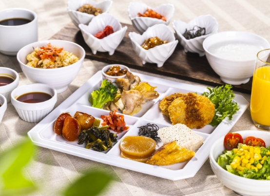 朝食ビュッフェは、麹味噌を使ったお味噌汁、宿儺かぼちゃのスイーツ、飛騨牛コロッケなど地元の味覚が並び、その他の郷土料理も含め、飛騨高山ならではの食材を活かしたメニューが魅力です。