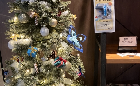 高山市石浦町の障害者就労継続支援B型事業所「クレヨン・ひだ作業所」で作られた飾りに彩られたツリーをホテルロビーに展示しています。同作業所の利用者様により製作されたカゴをフロントで使用しており、このつながりから、リースやプレゼントをかたどった飾りをロビーのツリーに付けることになりました。同作業所・理事長からも、「作品を褒めてくれたり、外に作品を出してくれたりする人がいることが大切」とのお話をいただいている取組みです。
