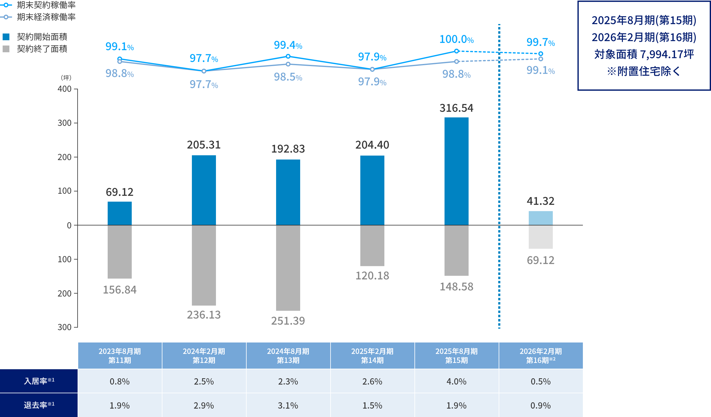 - 入居率:契約開始面積÷総賃貸可能面積 退去率:契約終了面積÷総賃貸可能面積