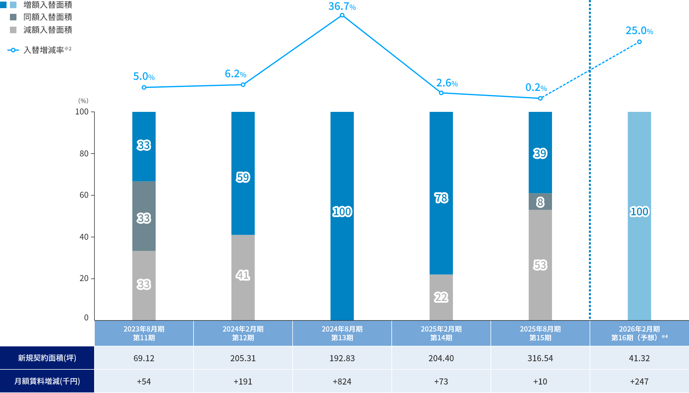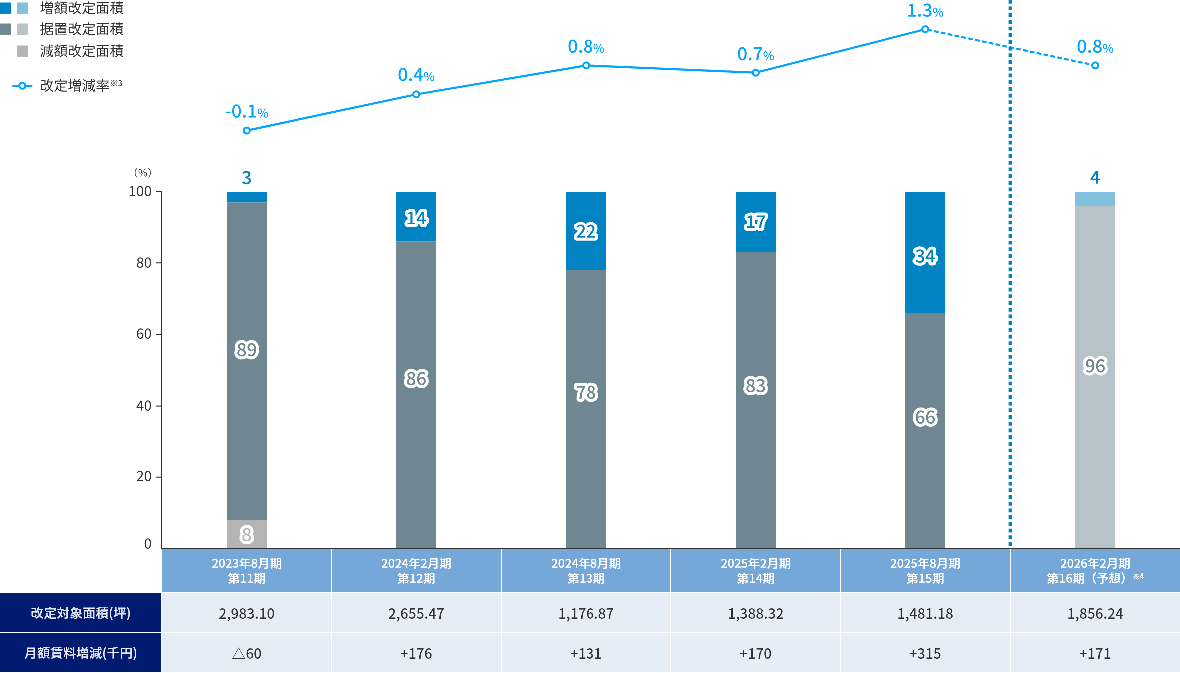 - 入替増減率:(入替後の共益費を含む賃料 – 入替前の共益費を含む賃料)÷ 入替前の共益費を含む賃料