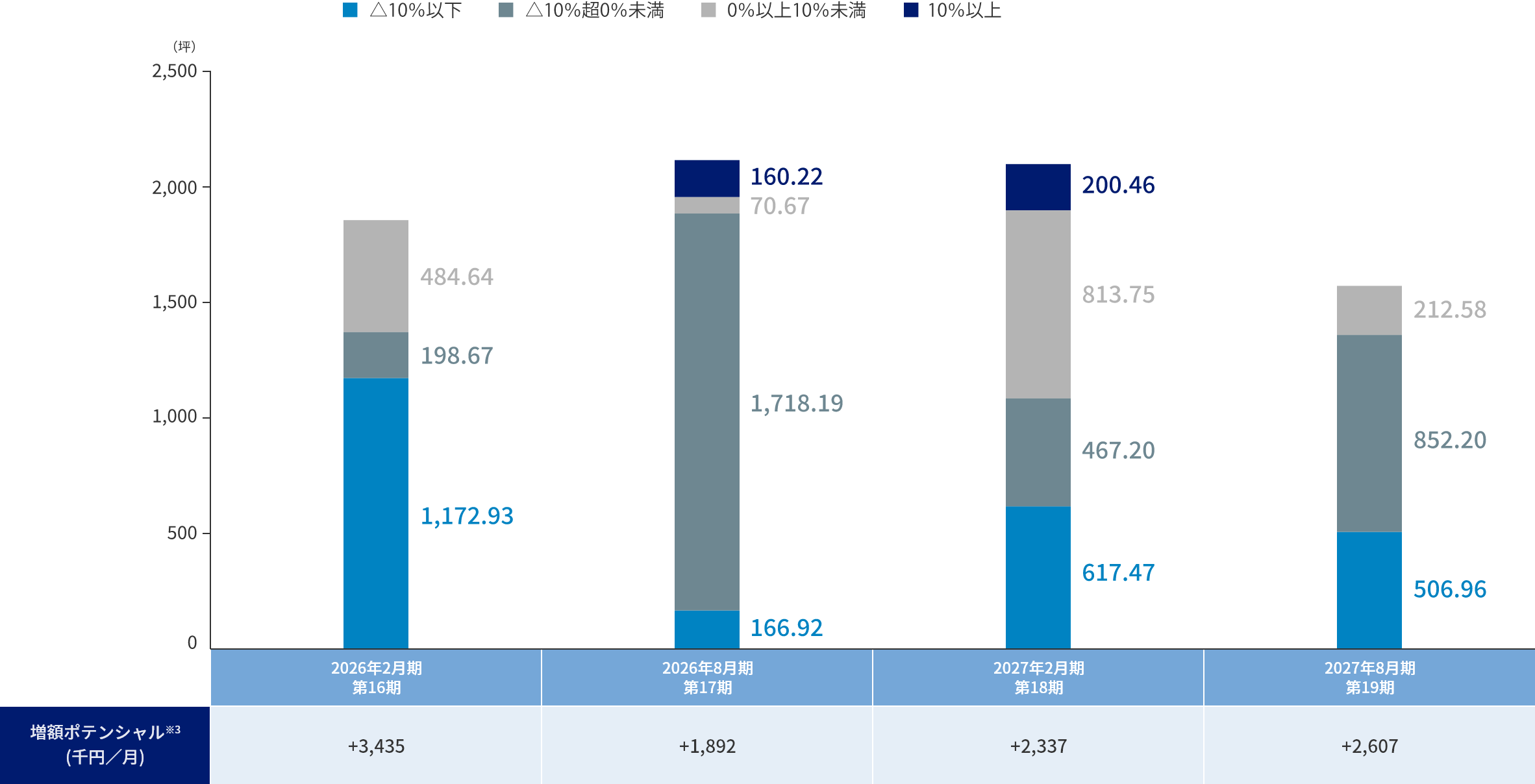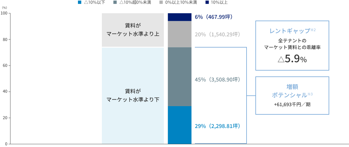 - 増額ポテンシャル:レントギャップ△10%以下と△10%超0%未満のテナント賃料単価が想定新規賃料単価となった場合の金額