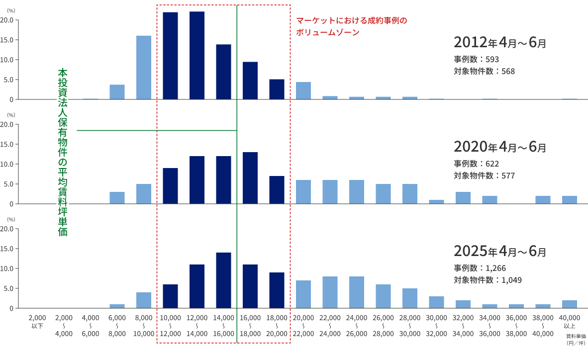 - 成約事例のボリュームゾーンで需要の厚い、坪10,000~20,000円の賃料単価物件を多く保有