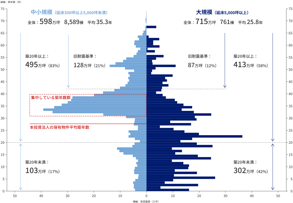 - 中小規模オフィス供給のボリュームゾーンである築30年~40年を下回る物件を多く保有