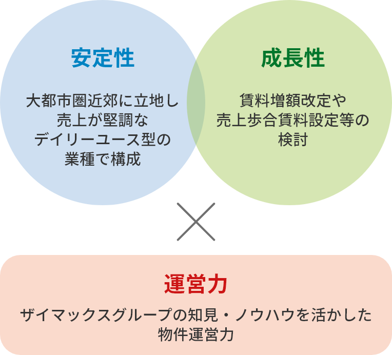 - 現在のインフレ局面を考慮し賃料増額改定・売上歩合賃料の設定等、収益向上に寄与する運用を目指します。