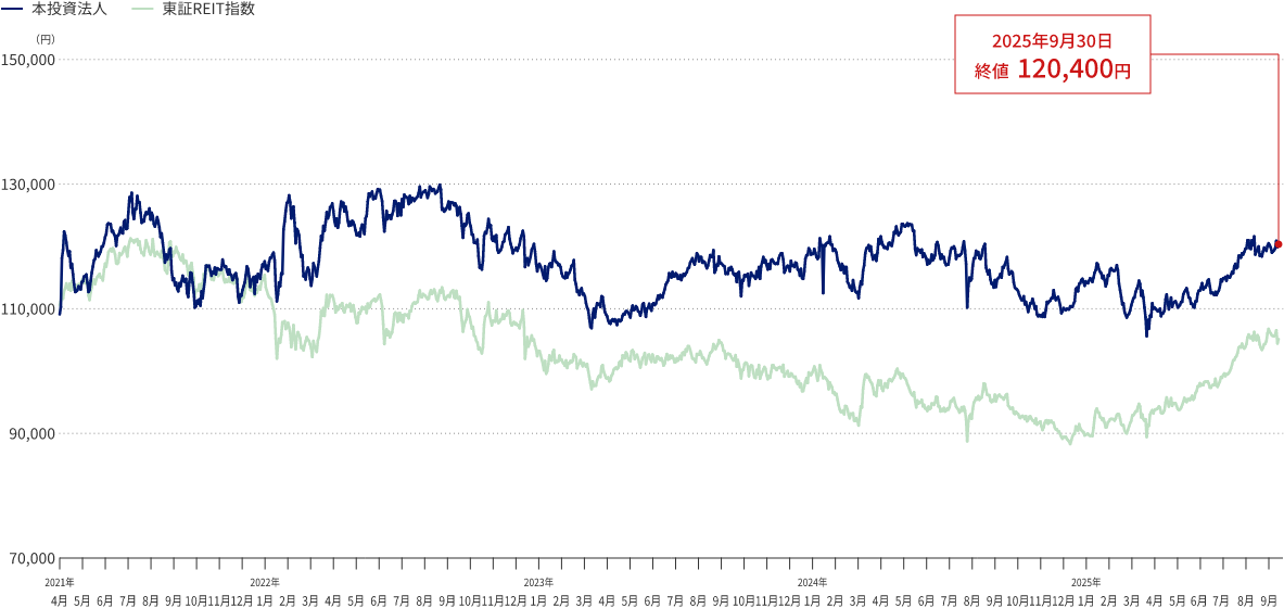 本投資法人の投資口価格の推移(2025年9月30日時点)