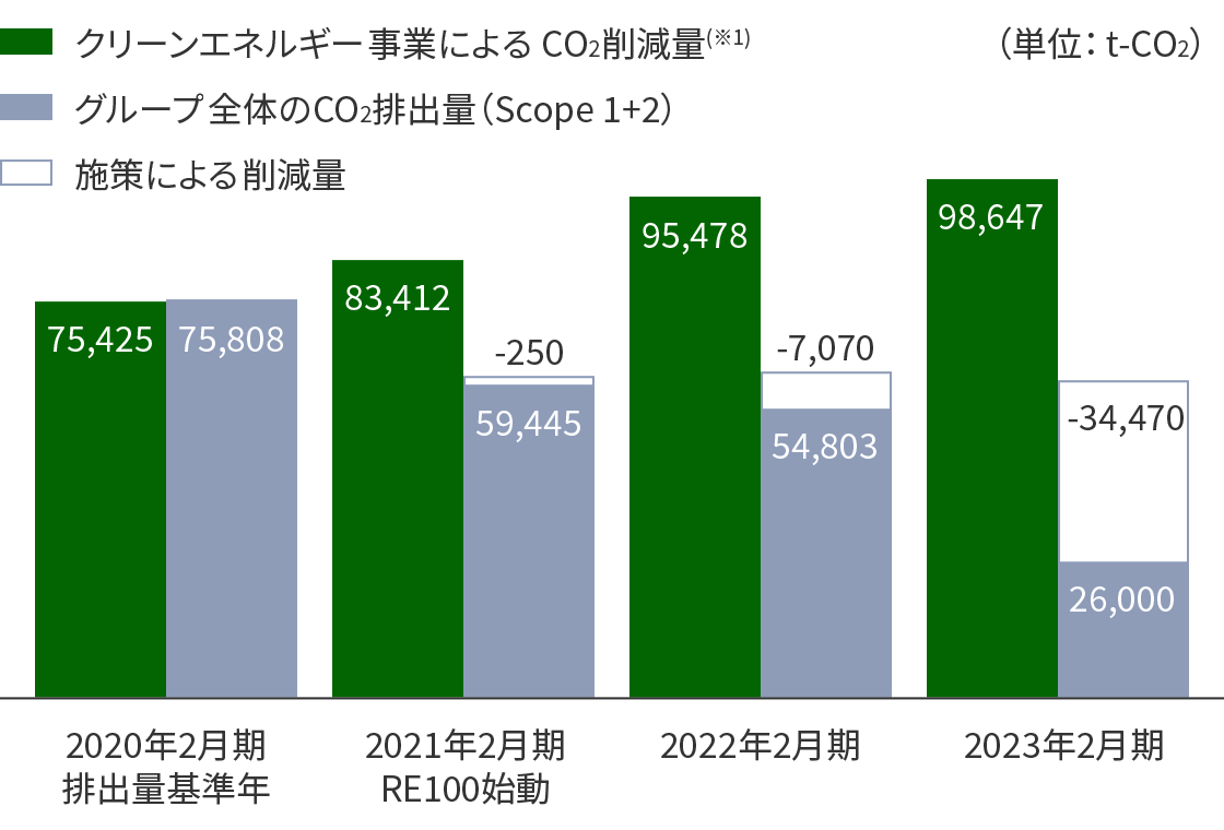 クリーンエネルギー事業の成長(CO2削減量の増加)と再生可能エネルギー由来の電力へ切替・オフセット(CO2排出量の削減)を推進