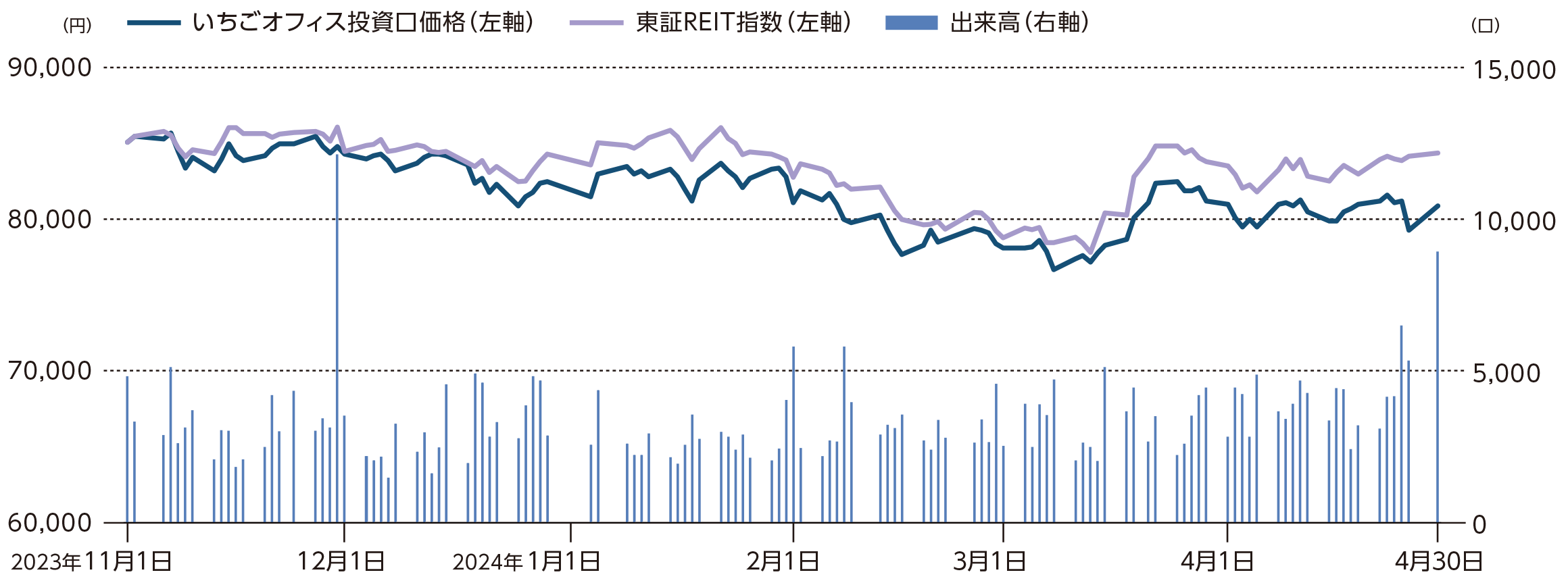 - 東証REIT指数は、2022年11月1日(期初はじめの営業日)の東証REIT指数を同日の本投資法人の投資口価格として指数化