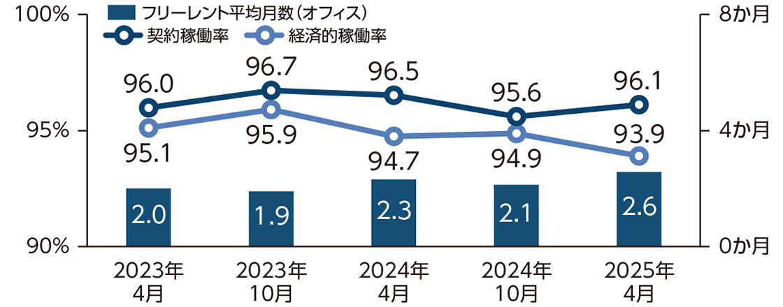 フリーレント平均月数、契約稼働率、経済的稼働率の推移(オフィス)