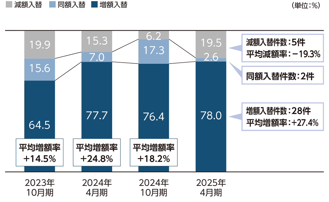 - 約80%が増額入替、約30%の増額率を実現(従前賃料比)