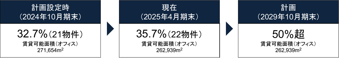 - 計画的に環境認証を取得(毎年3~4物件)し、段階的に比率を高めていく