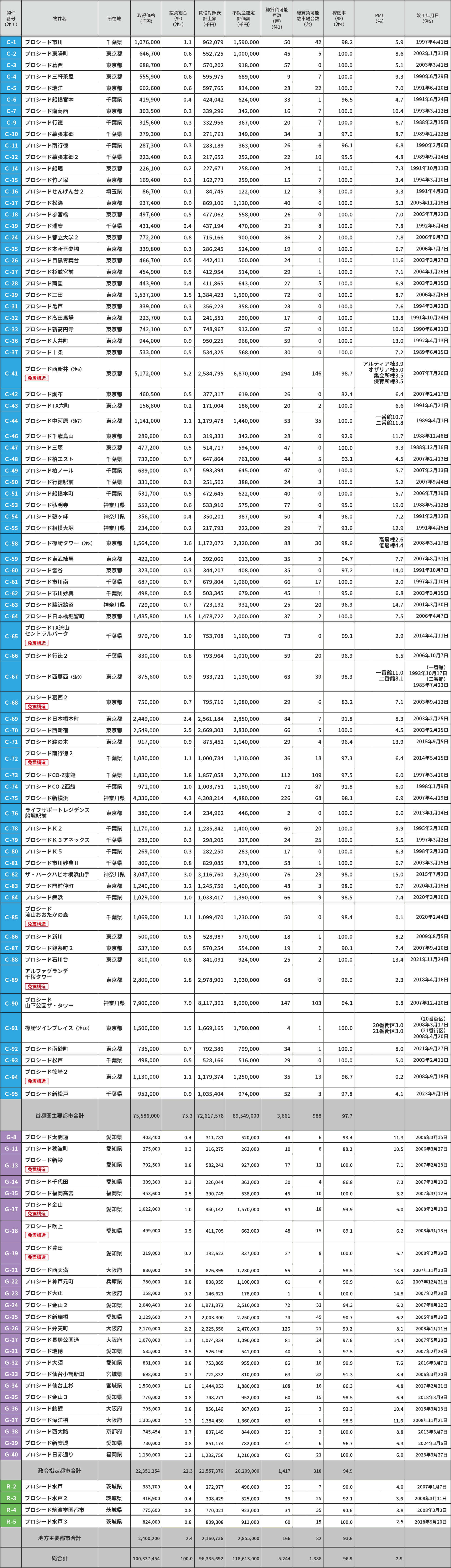- (注9)(C-67)プロシード西葛西は独立した2棟の建物から成り立っているため、PML及び竣工年月日を2棟それぞれについて記載しています。