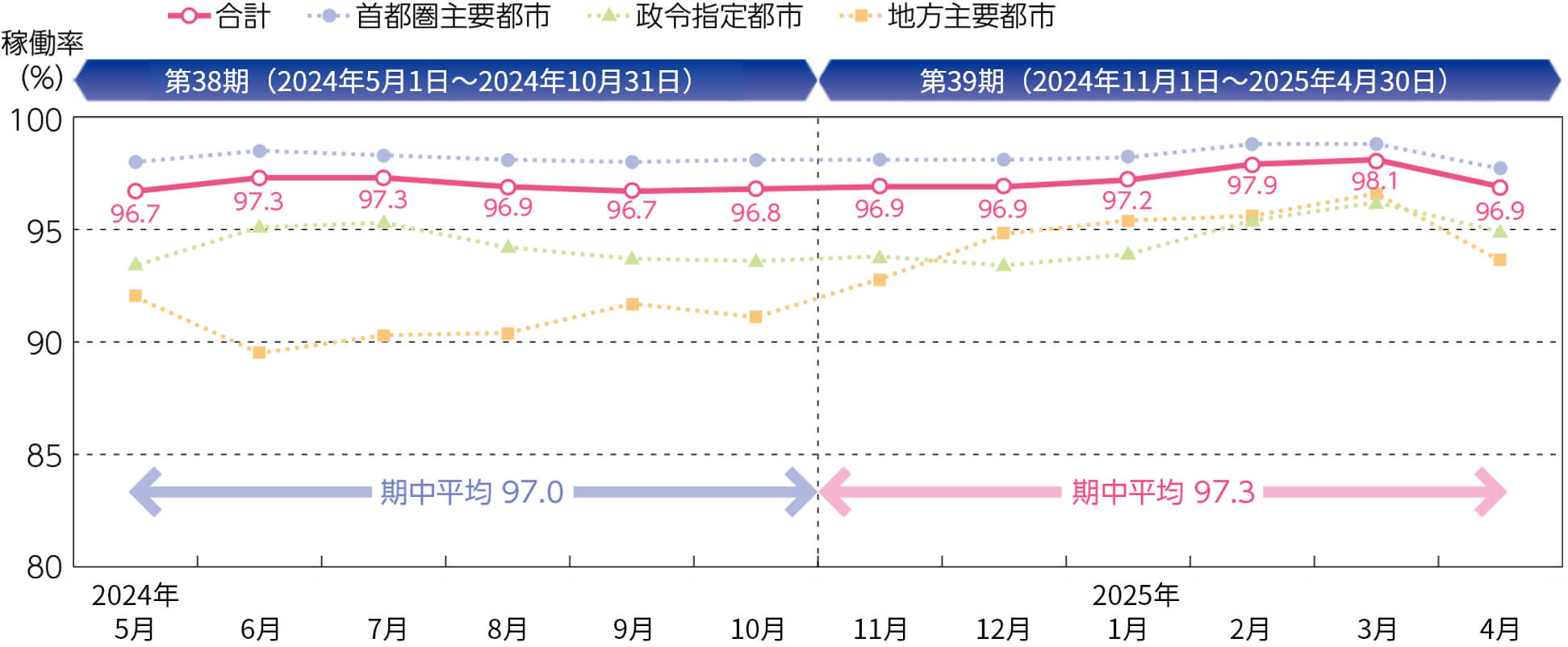 本投資法人の所有する物件は、継続して稼働率95%以上という高い水準を維持しています。今後もその継続を目標として安定的な資産運用を行っていきます。