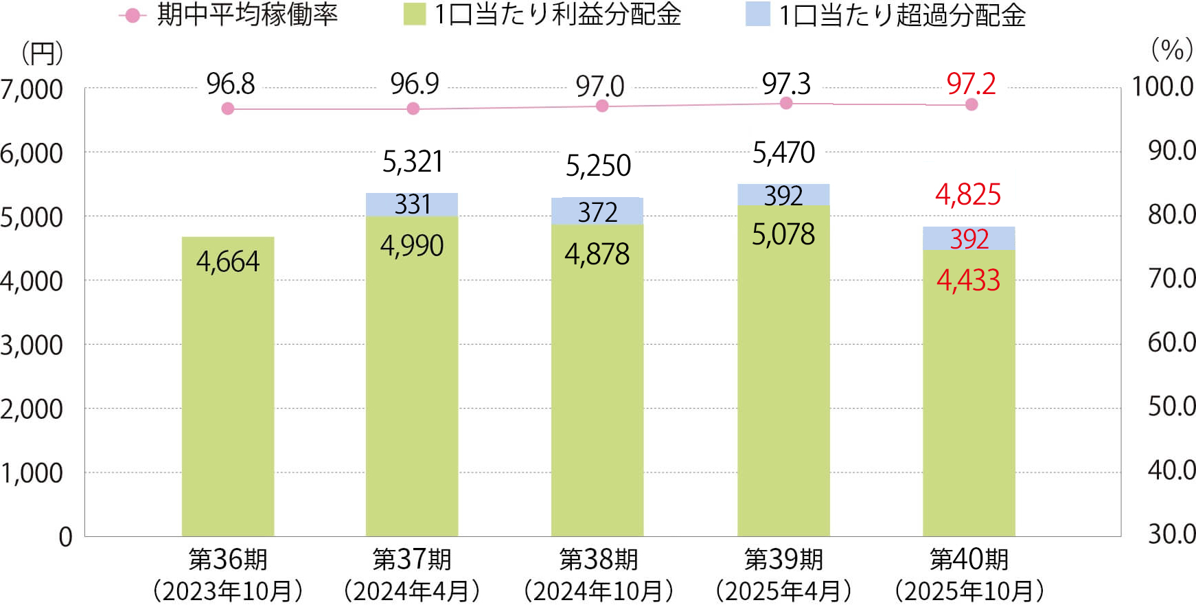 さて、このたび、本投資法人は、第40期(2025年10月期)の決算を迎えることができましたので、ここに当期における運用状況の概況と決算について、ご報告申し上げます。当期は、ポートフォリオの競争力向上のため、2025年5月13日に(C-96)プロシード桜坂(取得価格850百万円)を取得し、2025年8月1日に(C-12)プロシード幕張本郷2(譲渡価格264百万円)を譲渡しました。その結果、当期末現在における本投資法人の保有資産は107物件、取得価格の合計は100,964百万円、総賃貸可能面積は207,046.76㎡となりました。また、保有資産については引き続き、賃料や礼金収受等の収入の増加を図りつつ、建物維持管理コストの削減にも取組みました。こうした取組みの結果、営業収益3,642百万円、経常利益1,208百万円、当期純利益1,207百万円を計上し、投資口1口当たりの利益分配金は4,433円となり、公表済の予想分配金を上回ることができました。さらに継続的な利益超過分配(出資の払戻し)及び定期借地権償却等相当額の一時差異等調整引当額の計上による利益超過分配を実施することとし、この2つの利益超過分配金合計の392円を加えた4,825円を1口当たり分配金(利益超過分配金を含む)とさせていただきました。