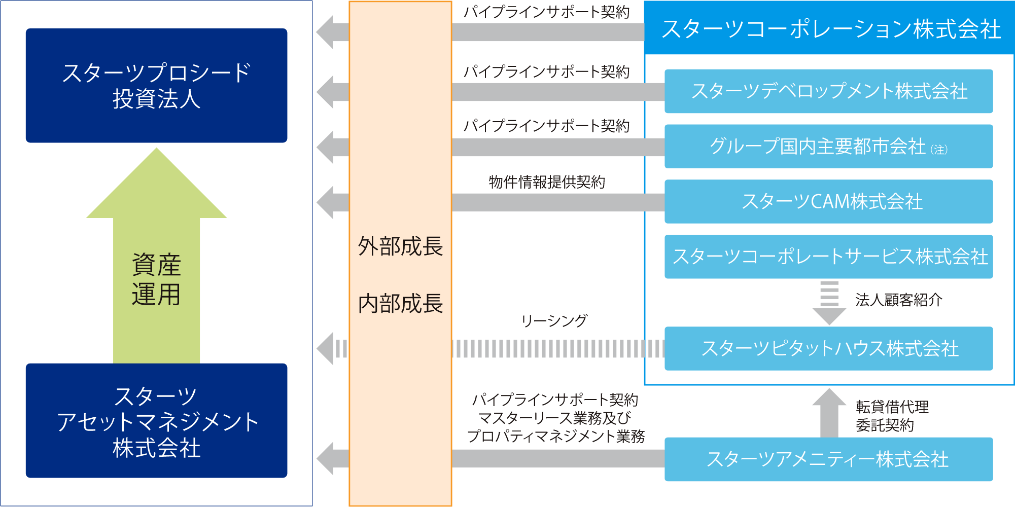 スターツグループ各社の特徴を活かして、パイプラインサポート契約及び物件情報提供契約による協力関係を通じた資産規模の着実な成長と、プロパティマネジメント会社への一括委託及びリーシング業務の再委託を通じた運用資産の管理運営コストの削減、稼働率の向上や賃料単価の上昇等を目指します。