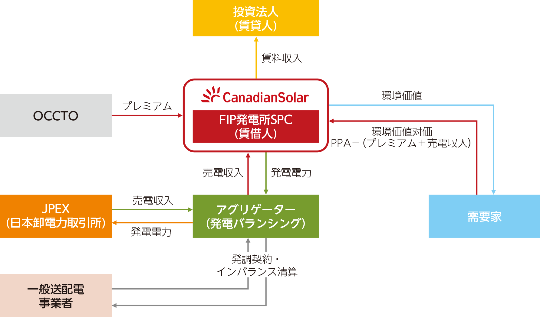 FIP発電所SPC、アグリゲーター及び需要家間の契約により、コーポレートPPAスキームが構成され、それらの契約から生じるFIPプレミアム、売電収益、環境価値対価などを源泉として投資法人の賃料収入が担保されます。
